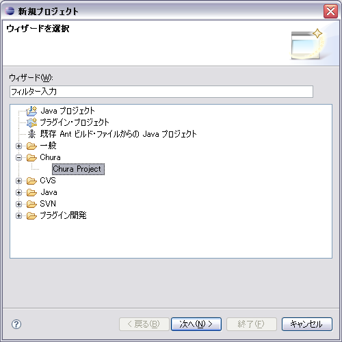 ファイル→新規→プロジェクトで「新規プロジェクト」画面を表示います。下の画像のように Chura という項目があります。そこで Chura → Chura Project を選択し、「次へ」をクリック。